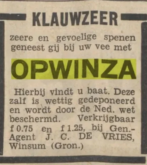 Bij klauwzeer zou de zalf het vee helpen. Maar het mond- en klauwzeervirus dat vanaf 1838 rondging en in 1911 tot een ramp had geleid, kon je er natuurlijk niet mee bestrijden. Verder beweerde De Vries dat het hielp als een koe gevoelige uierspenen had. Het was volgens hem een probate uierzalf bij het melken dat toen handmatig gebeurde en voor een koe met gevoelige spenen een drama was.